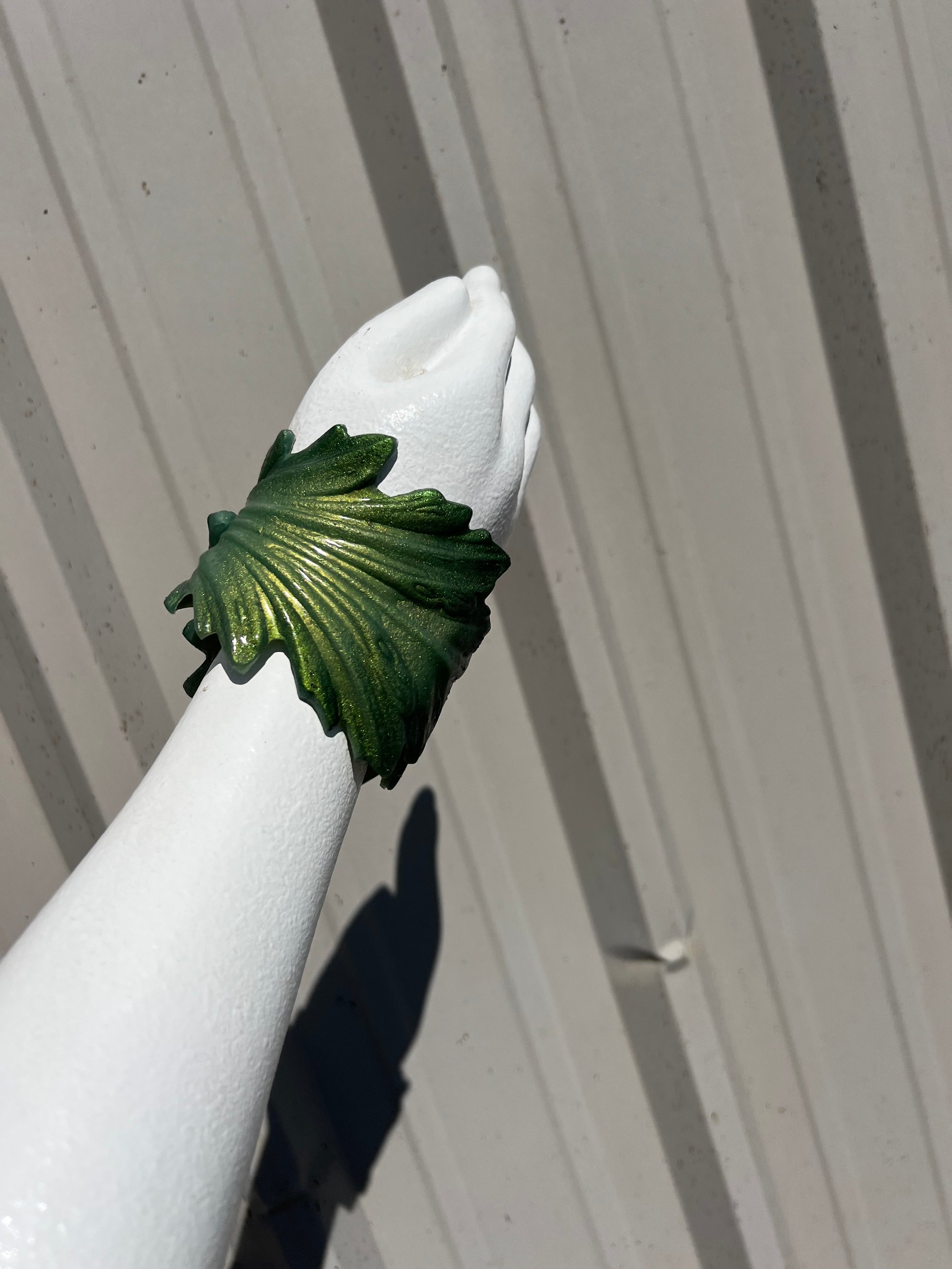 These leaf cuffs are the perfect extra accessory to compliment your look. They come in sizes S (6-7in), M(8-9in), L (9.5-10in). They can be done in one solid color, two colors or a solid colorshift.