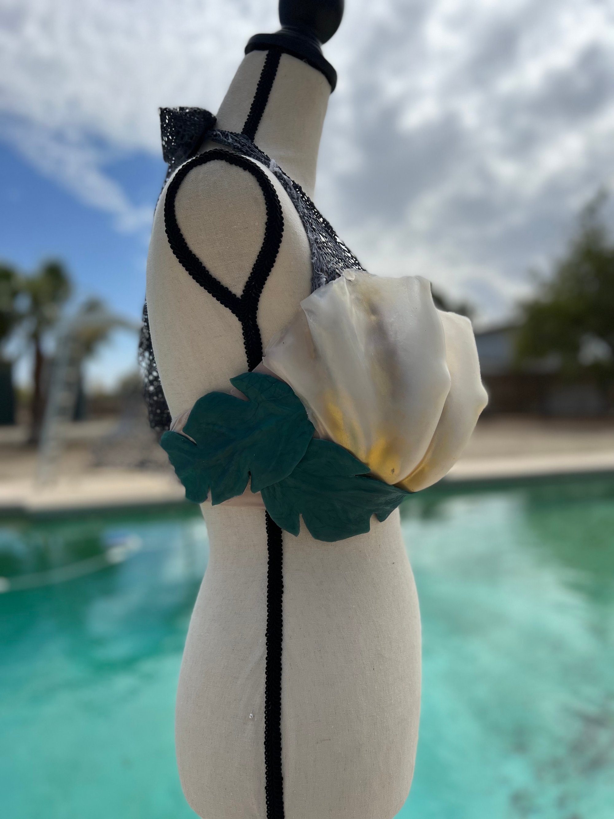 Add ons include halter netting straps, hand sewn faux pearls and full coverage of the band with extra leaves.